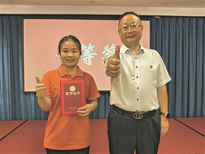 贵阳工商养老公司党委书记、董事长薛仁政(右)与一等奖选手赵珊珊合影。
