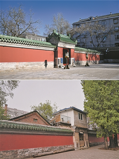 拼版照片:上图为腾退修缮后的庆成宫正殿东侧区域;下图为翻拍的庆成宫正殿东侧区域腾退修缮前的资料照片。