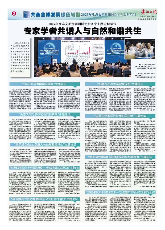 共话人与自然和谐共生,共商全球发展绿色转型。7月6日,2025年生态文明贵阳国际论坛进入第二天,“2025美丽中国建设实践”主题论坛、“刑事打击与生态安全保护”主题论坛等多个主题论坛举行,来自