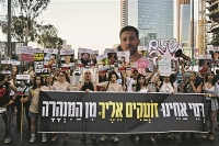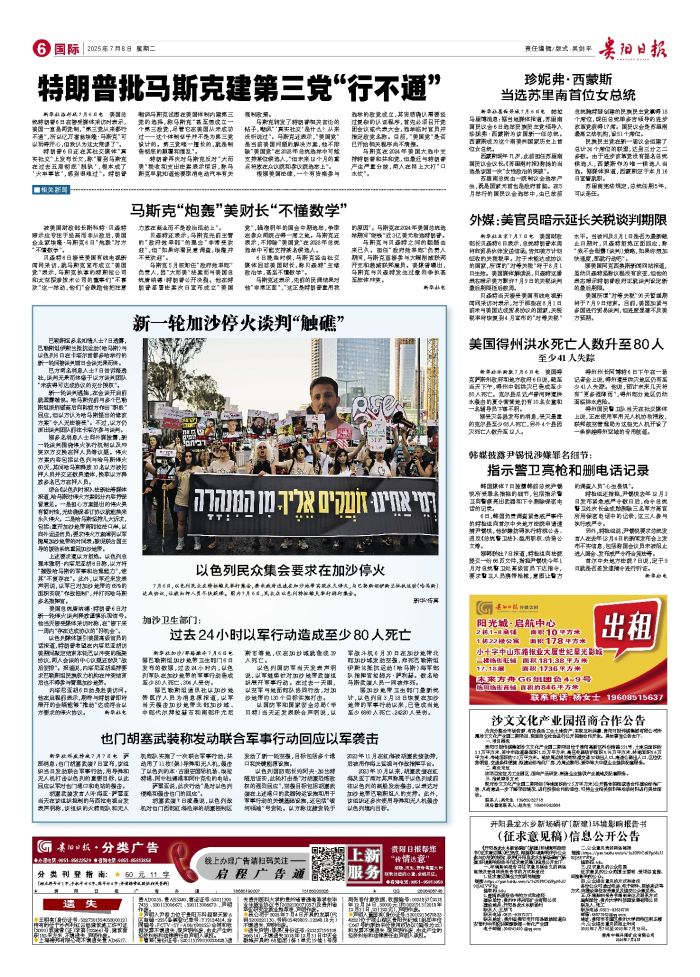 7月6日,以色列民众在特拉维夫举行集会,要求政府迅速在加沙地带实现永久停火,与巴勒斯坦伊斯兰抵抗运动(哈马斯)达成协议,让被扣押人员尽快获释。图为7月6日,民众在以色列特拉维夫举行游行集会。