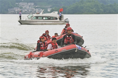 图为演练人员将“落水群众”救上救援艇并快速驶向岸边。贵阳日报融媒体记者 杨才江 摄