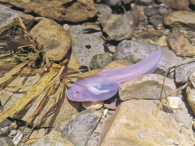 贵州双河洞内发现的活体生物盲鱼(右图)。