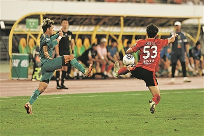 7月20日晚,贵州筑城竞技球员(左)在场上拼抢。贵州筑城竞技俱乐部/供图
