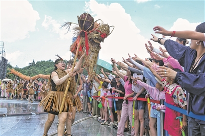 14时30分,一阵激昂的铜鼓声响起,20名舞者牵引着两条18米长的水龙入场,拉开白天活动的序幕。水龙在半空中灵动飞舞,所到之处人群欢呼雀跃,纷纷向水龙泼水祈福。“德江水龙节是省级非物质文化遗产代表性项目,水龙巡游寓意风调雨顺、五谷丰登,今天能把这份祝福传递给这么多朋友,我感到非常荣幸。”水龙队领队、水龙节(德江水龙节)铜仁市级代表性传承人杨益江说。