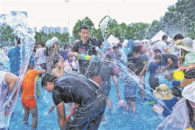 在众多参与者中,来自黑龙江的刘中和同伴拿着巨大的水枪装备,一起喊着口号,向对方阵营发起一轮又一轮“进攻”。他兴奋地说:“这种大规模的泼水活动太好玩了,大家来自不同的地方,但在这里没有陌生感,一起泼水、一起欢笑,感觉特别过瘾。”