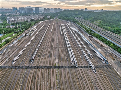 2025年6月30日在南京动车段南京南动车运用所拍摄的动车组列车(无人机照片)。