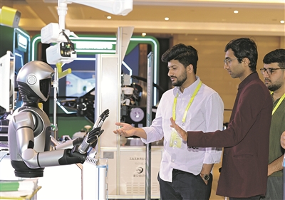 图为24日,嘉宾在中国-东盟教育交流周主会场二楼展示区和展出的机器人互动。