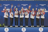 7月25日,在新加坡举行的2025年世界游泳锦标赛花样游泳集体技巧自选决赛中,中国队夺得冠军。图为中国队在颁奖仪式上庆祝。 新华/传真