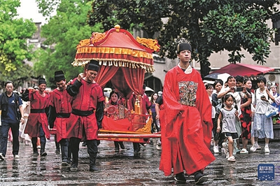 当地群众在镇远古城参加“龙神嫁妹”民俗巡游展演。