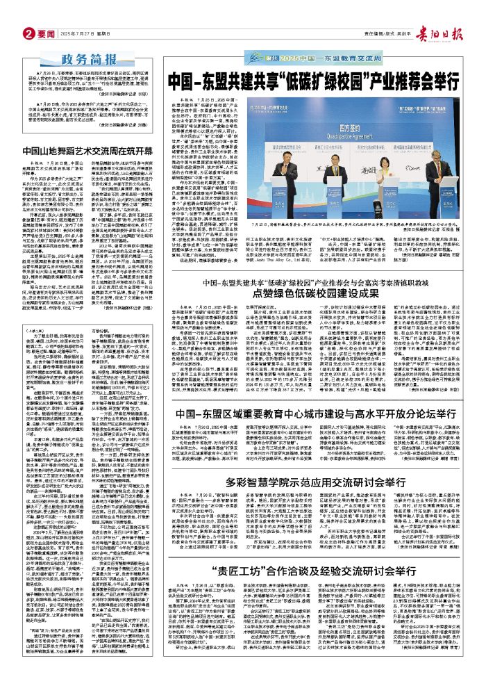 本报讯 7月25日,2025中国-东盟共建共享“低碳扩绿校园”产业推荐会与会嘉宾专程前往清镇职教城参观考察,聚焦职业教育领域绿色低碳发展实践与产教融合创新成果。 考察团一行首先乘车游览