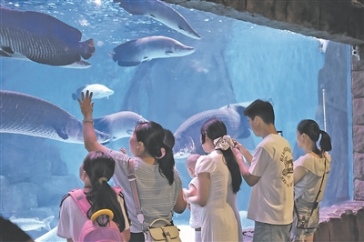 斑斓鱼群悠然穿梭,梦幻水母在光影中轻盈游弋……入夏以来,多彩贵州城极地海洋世界化身欢乐海洋,成为炙热天气里备受追捧的清凉“打卡地”,吸引了众多游客前来探索清凉秘境、感受海洋气息。图为7月26日,游客在多彩贵州城极地海洋世界观赏鱼类。