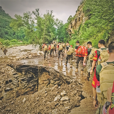 ▼7月28日,武警北京总队官兵徒步10余公里前往怀柔区琉璃庙镇运送物资。