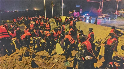 ▶7月28日,武警北京总队千余名官兵在密云区宁村新桥构筑堤坝。