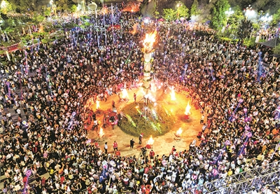 连日来,云南多地欢度火把节,节日活动精彩纷呈,游客如潮。图为在云南省大理白族自治州南涧彝族自治县彝族火把节的篝火晚会现场,游客与彝族群众一起载歌载舞。 新华/传真