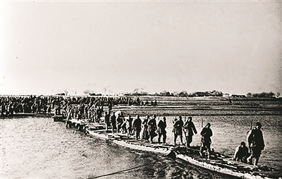 1945年9月,新四军参加淮阴战役的部队通过运河浮桥。
