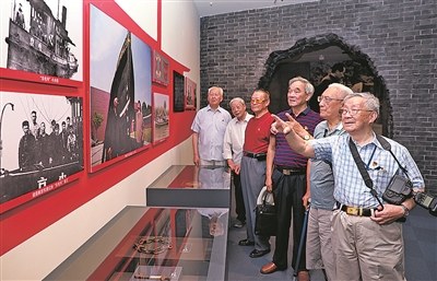 2019年7月4日,在南京渡江胜利纪念馆,王生(右一)与南钢离休老干部参观史料陈列展,庆祝新中国成立70周年。