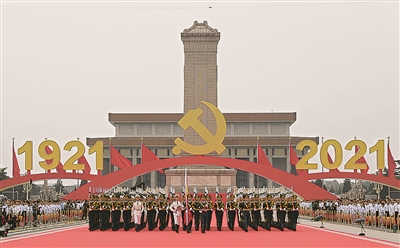 2021年7月1日上午,庆祝中国共产党成立100周年大会在北京天安门广场隆重举行。这是国旗护卫队准备升旗。 新华/传真