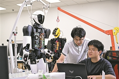 2025年5月29日,在位于湖北省武汉市的华中科技大学机械科学与工程学院,研究人员对“荆楚”人形机器人进行代码调试。 新华/传真