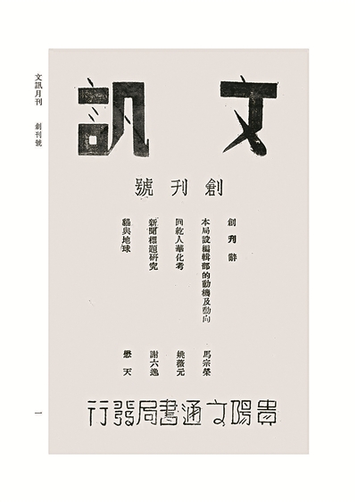 1941年6月,贵阳文通书局编辑所成立后,马宗荣任所长,谢六逸任副所长,编辑所又编辑出版《文讯月刊》。《文讯月刊》于1941年10月10日创刊,1948年12月5日出版第九卷第五期后终刊,前后共出版了9卷55期49册,发表各类文章或译作760余篇。该刊的主编为谢六逸、顾颉刚、白寿彝等名家,撰稿人包括唐弢、李健吾、艾芜、碧野等文化名人,主要发表学术论著、文艺作品、名著提要、文化动态等,同时兼顾文学、历史、科技、哲学、艺术、工业等方面,为抗战文化、大后方文学等方面的研究保存了参考史料。
