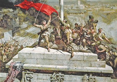 魏景山:画写实油画并不等同于画历史照片,而是经过深思熟虑、艺术想象和艺术加工的创作。人物的组合是决定这幅画的关键。为此,我们塑造了那个注视着迎风向上的红旗的战士,紧握枪杆、昂首挺立的小战士,头部受伤、兴奋地召唤着同志们的老战士,以及那位看着手表、记下那个令人难忘的历史时刻的指挥员……