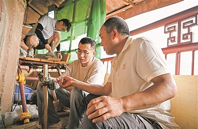 牟常有(右一)在麦积山石窟157窟前指导徒弟李浩亮制作用于塑像修复的木骨架。
