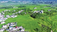 时下,花溪区高坡乡万亩梯田水稻长势正旺。从空中俯瞰,在独特梯田地貌和绿油油水稻的衬托下,石门村、云顶村等山村如世外桃源,吸引众多市民游客前往拍照打卡。 图为8月2日拍摄的高坡乡万亩梯田(
