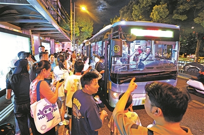 夜游甲秀楼的市民游客排队乘坐46路公交车。 贵阳日报融媒体记者 周永 摄