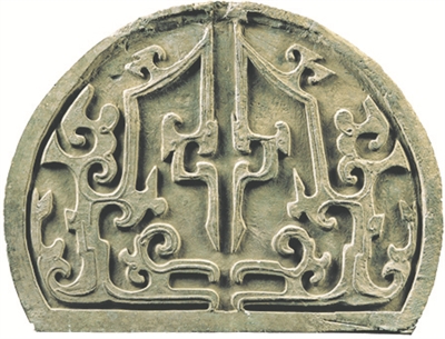 夔是传说中一种近似龙的动物,多为一角、一足、口张开、尾上卷。辽宁姜女石秦汉行宫遗址出土的夔龙纹大瓦当当面由两条造型奇异的夔龙纹组成,左右对称,姿态矫健。其制作技法是先画出纹饰轮廓,再用平刀加以阴刻,阴阳分明,线条圆润、简洁,夔龙纹反复盘曲,除了夔龙纹自身形成的曲线美之外,纹饰间的空隙部位同样形成了精美的留白空间。它与一旁展出的秦始皇陵夔龙纹大瓦当相比,两者外观惊人相似,显示出秦帝国与秦文化的强势扩张。