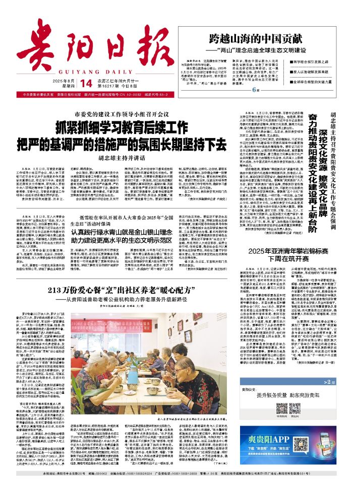 本报讯 8月13日,省委常委、市委书记胡忠雄主持召开贵阳贵安文化工作专题会。他强调,要深入学习贯彻习近平文化思想和习近平总书记在贵州考察时的重要讲话精神,深挖文化资源,擦亮文化品牌,奋力推动