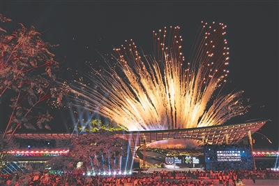 夜幕下的成都世园会成都国际友谊馆流光溢彩,屋顶中部的圆形天井与背后的山体、绿植有机融合,尽显“公园城市”的生态之美。来自世界各地的运动员相聚于此,场内歌舞飞扬、激情澎湃。