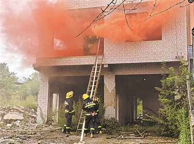 图为消防救援人员在湖潮乡下坝村举行消防实战演练。