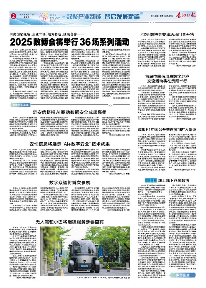本报讯 记者8月20日从贵阳市举行的相关新闻发布会上获悉,8月27日至30日,2025中国国际大数据产业博览会将举行36场系列活动。 2025数博会系列活动在规模、形式、内容上相较往年