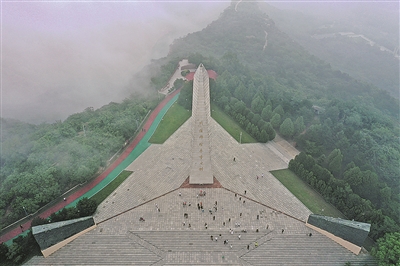 山西阳泉市狮脑山上,40米高的百团大战纪念碑如同一柄直插云霄的锋利刺刀,傲然矗立。近日,来自全国各地的群众怀着崇敬之情,在纪念碑前敬献鲜花,缅怀先烈。