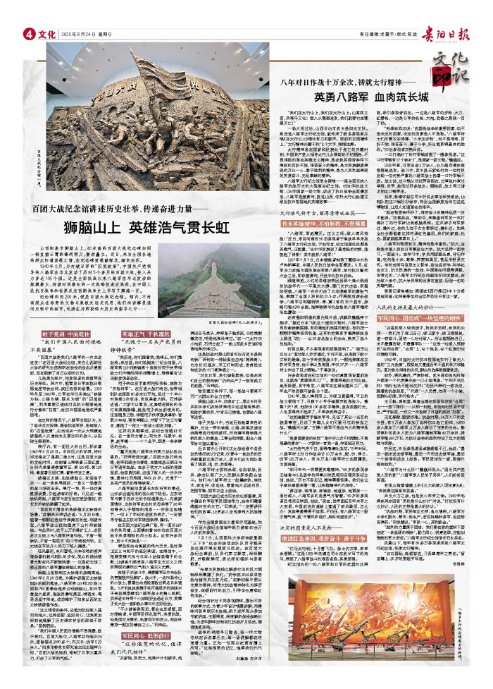 山西阳泉市狮脑山上,40米高的百团大战纪念碑如同一柄直插云霄的锋利刺刀,傲然矗立。近日,来自全国各地的群众怀着崇敬之情,在纪念碑前敬献鲜花,缅怀先烈。 1940年8月,为打破日军的“囚笼