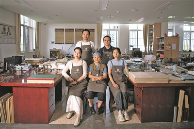 安徽省图书馆的古籍修复师们合影留念(前排从左至右依次为:耿宁、周亚寒、张文文,后排从左至右依次为:金鑫、臧春华)。