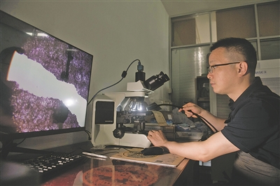 古籍修复师臧春华在使用专业仪器查看纸张纤维。