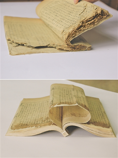 古籍修复前后的对比图(上图为修复前的古籍,下图为修复后的古籍)。