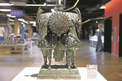 中国工艺美术大师刘雍的经典作品铸铜雕塑《盛世鼓》作为贵州工艺美术馆的“镇馆之宝”,布展在进馆大门的显眼处,这件非卖品体现了艺术家鲜明的创作特色。铜鼓蕴含着千百年来苗、侗、布依等贵州少数民族团结、昂扬的精神内涵。《盛世鼓》以苗族独创的“四面鼓”为原型,鼓身与底座的浮雕生动演绎《苗族创世史诗》的古老传说,四匹连体飞龙马(布依族图腾)构成的鼓架,寓意贵州少数民族借时代东风腾飞奋进,尽显文化厚重与时代精神。