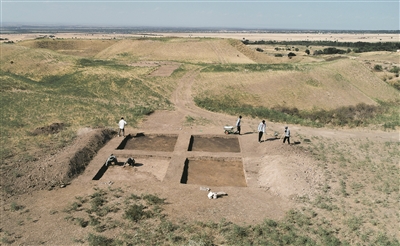 2023年8月9日,考古人员在中哈联合考古项目拉哈特遗址探方上工作(无人机照片)。 新华/传真