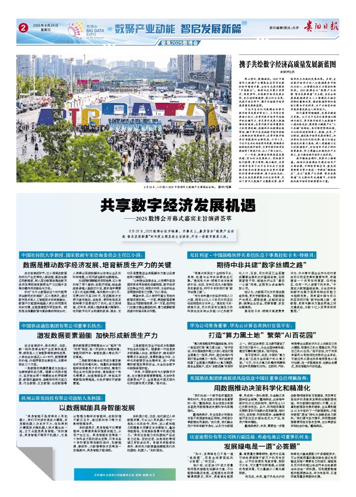 8月28日,2025数博会拉开帷幕。开幕式上,嘉宾紧扣“数聚产业动能 智启发展新篇”的年度主题发表主旨演讲,开启一段数字探索之旅。 本报评论员 黔山秀水,数潮涌动。2025中国国际