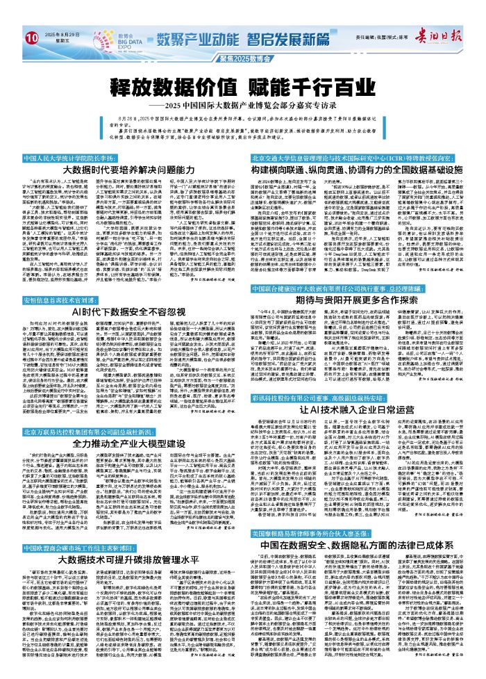 8月28日,2025中国国际大数据产业博览会在贵州贵阳开幕。会议期间,参加本次盛会的部分嘉宾接受了贵阳日报融媒体记者的专访。 嘉宾们围绕本届数博会的主题“数聚产业动能 智启发展新篇”,就