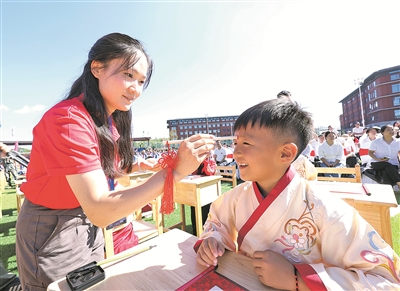 9月1日,湖南师范大学附属贵安学校教师在为小学一年级新生完成朱砂启智礼仪。 贵阳日报融媒体记者 石照昌 摄