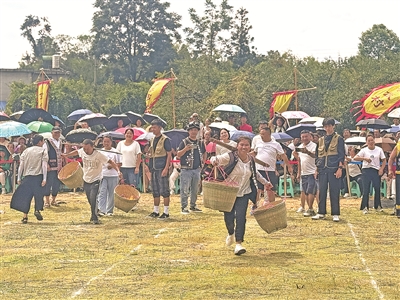 市民游客与当地村民一起兴致勃勃地参加挑担运粮比赛。