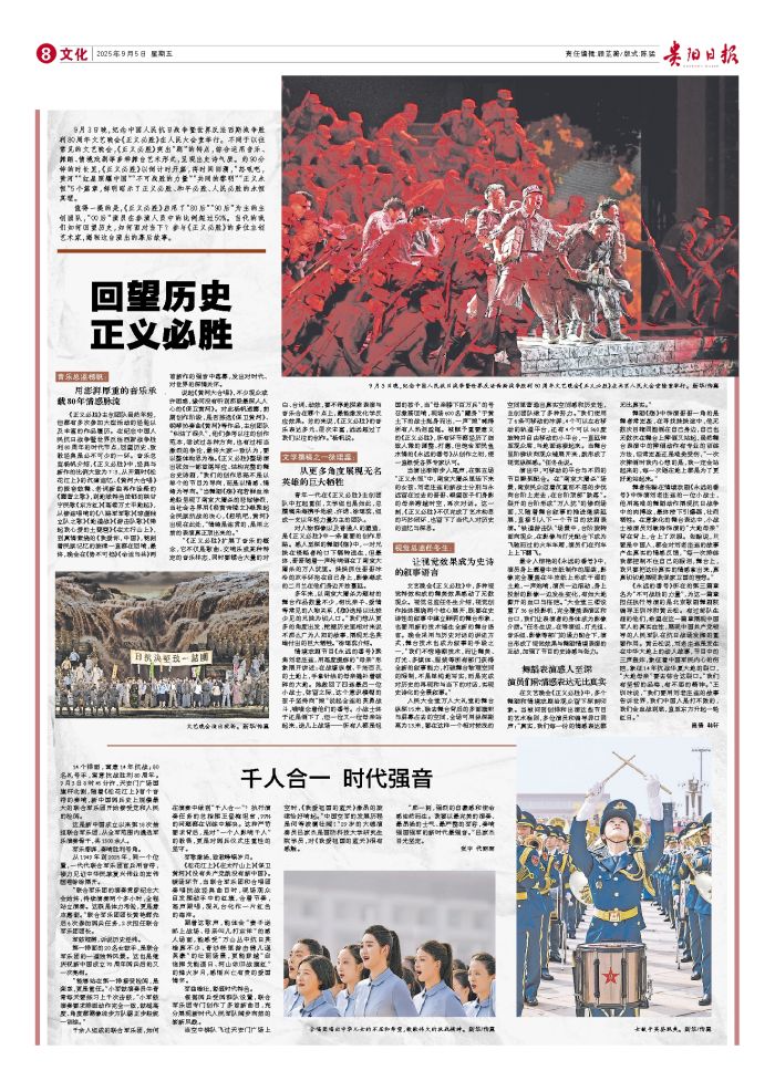 9月3日晚,纪念中国人民抗日战争暨世界反法西斯战争胜利80周年文艺晚会《正义必胜》在人民大会堂举行。不同于以往常见的文艺晚会,《正义必胜》突出“剧”的特点,综合运用音乐、舞蹈、情境戏剧等多种舞