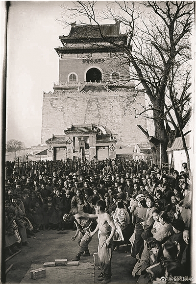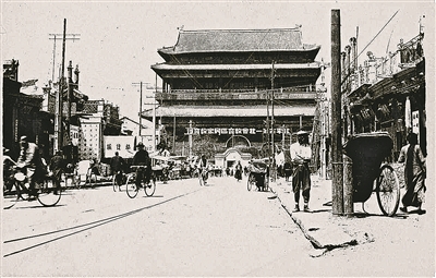 1930年前后的钟楼上,可以看到“北平通俗电影”的字样,钟楼下的广场是民众商场。
