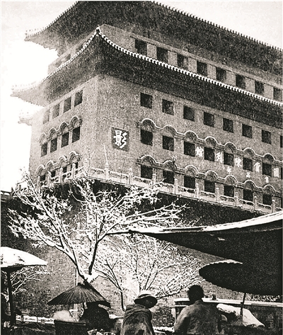 1928年11月,正阳门北平国货陈列馆首次对公众开放。到了20世纪30年代初,一层大厅还开设了电影院,时人称为“国货陈列馆电影院”或“前门箭楼电影院”。从老照片中可以看到,当时的箭楼两侧高悬“电影”二字,极为醒目。有人回忆:“1937年2月15日,前门箭楼电影院放映《塞北风光》和《百灵庙大战》,场场爆满……上述电影放映时,影片里的一个爱国口号、一个打鬼子的特写镜头,观众都认为是喊出了民族的呼声。”