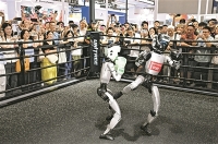 9月5日至8日,2025世界智能产业博览会在重庆举行。众多人形机器人在智博会上亮相,为观众带来不少乐趣。图为9月5日,观众在2025世界智能产业博览会上观看人形机器人拳击比赛。