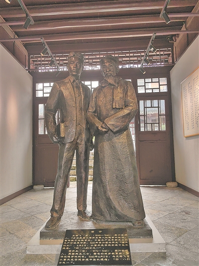 ▶贵阳达德学校旧址内的王若飞(左)和舅舅黄齐生的雕像。