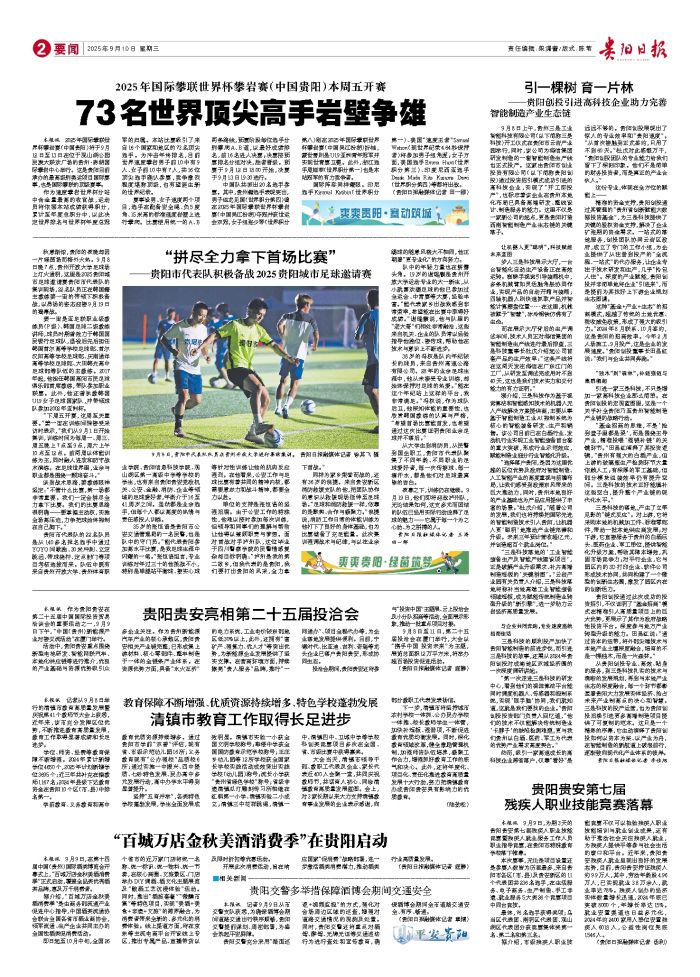 本报讯 2025年国际攀联世界杯攀岩赛(中国贵阳)将于9月12日至13日在位于观山湖公园民族大联欢广场的贵州·彩湖国际攀岩中心举行。这是贵阳目前承办的最高级别奥运项目国际赛事,也是国际攀联的