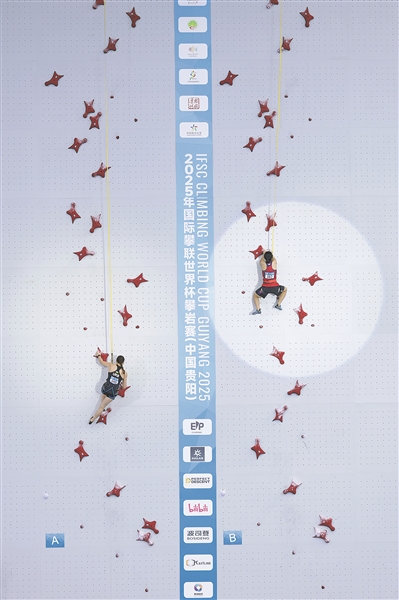 在2025年国际攀联世界杯攀岩赛(中国贵阳)速度赛预赛现场,女子组选手正在比赛。